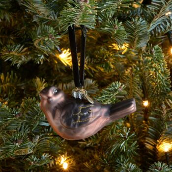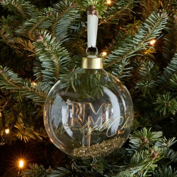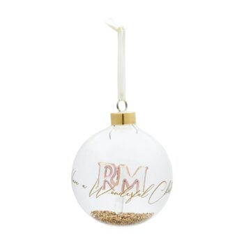 Het RM Loves Santa Ornament met een diameter van tien centimeter is een kerstbal van glas in de kleur champagne. Op het rookglas is met gouden glitters de tekst ‘RM ♡ Santa’ geschreven. De sluiting van de glazen bal is goudkleurig. Hang de chique bal in de kerstboom met behulp van het zwarte ophanglint.