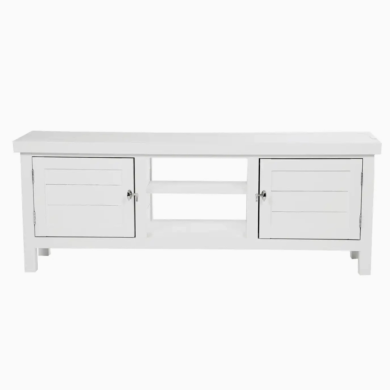 Wit houten tv-meubel met twee planken en deuren met metalen handgrepen