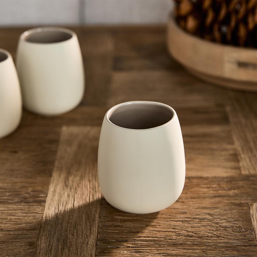 De Clement beker onderscheidt zich door hun bijzondere afwerking. De buitenkant is mat, wat zorgt voor een ingetogen en verfijnde look. De binnenzijde van de kop is daarentegen glanzend afgewerkt, wat een mooi contrast biedt en het geheel een subtiele luxe uitstraling geeft. Dit contrast tussen mat en glanzend maakt de beker niet alleen functioneel, maar ook een ware blikvanger op tafel.