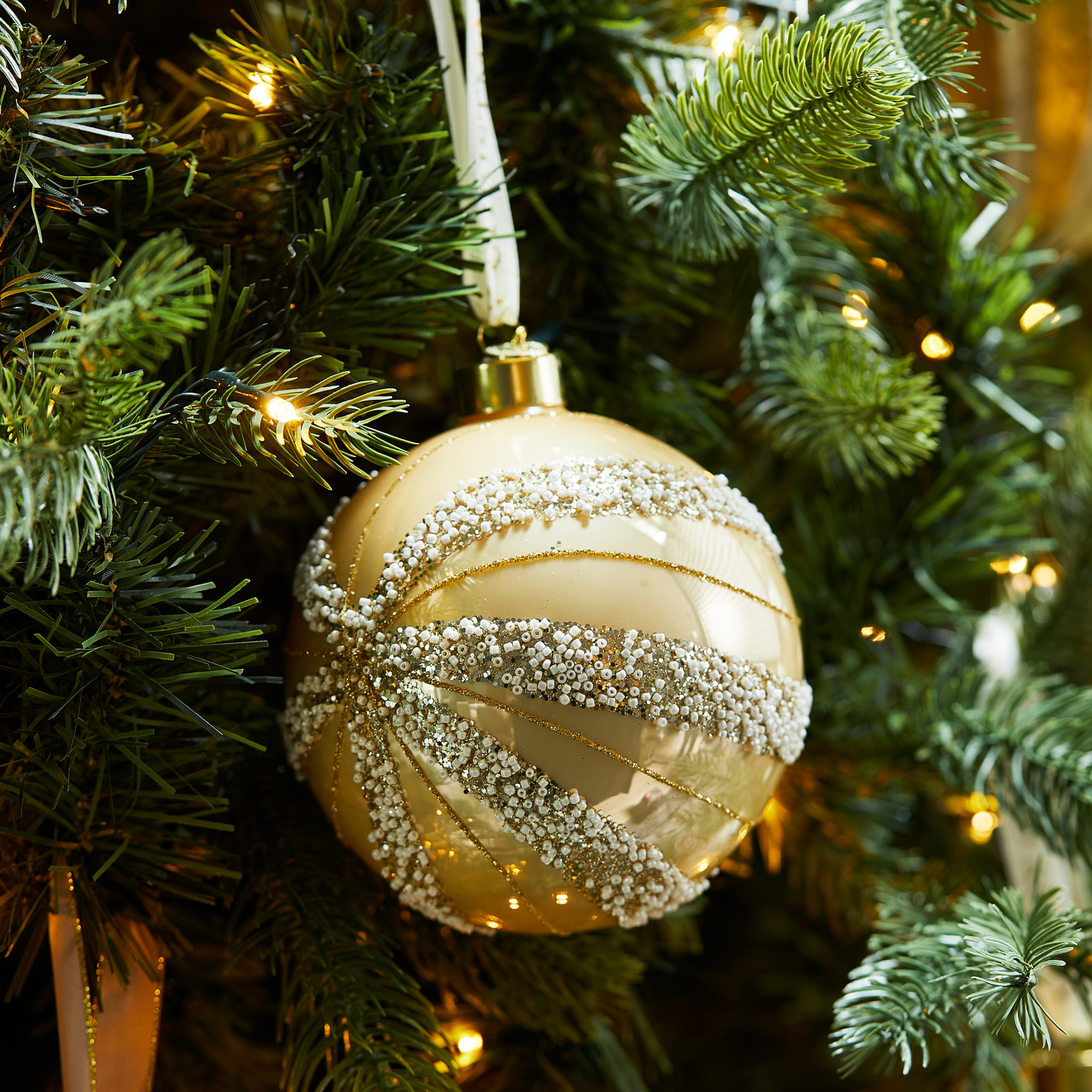Ontdek het betoverende Sparkling Waves ornament: een klassieke gouden kerstbal die rondom versierd is met glinsterende swirls. Deze tijdloze kerstbal past perfect in elke kerstboom en voegt een vleugje elegantie toe aan je feestelijke decor.