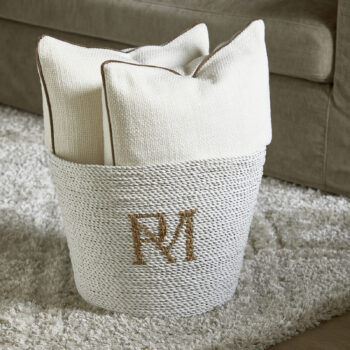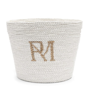 Dit is de RM Monogram Mand M. De mand is gemaakt van Raffia, Raffia is een materiaal dat vervaardigd is van dunne repen blad van de raffiapalm. Deze repen zijn met de hand aan elkaar zijn bevestigd. De afwerking resulteert in een patroon van natuurlijke bruine lijnen op een witte achtergrond, wat het RM-monogram vormt.