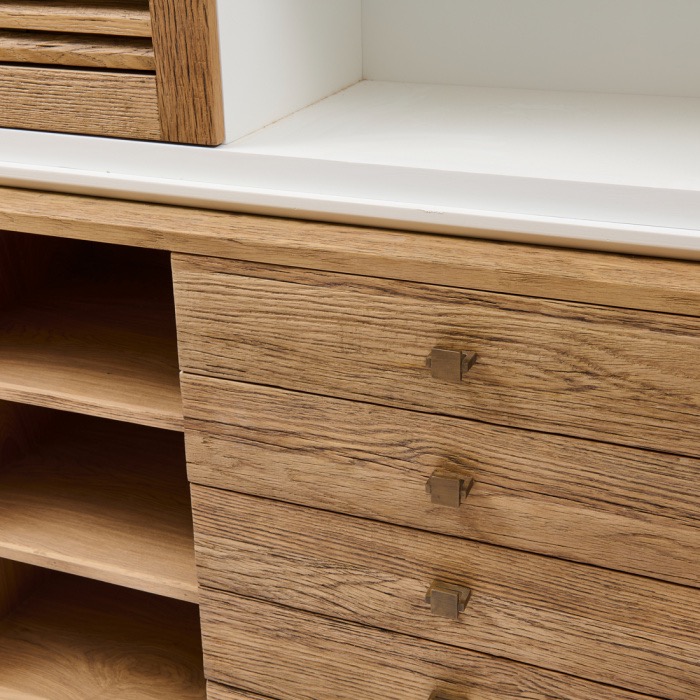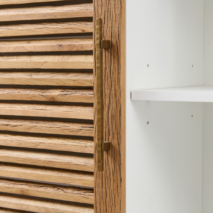 De lichte kleurstelling gecombineerd met de naturel houten accenten zorgt voor een warme, uitnodigende sfeer. Daarnaast is de kast afgewerkt met duurzame materialen die het onderhoud eenvoudig maken — ideaal voor dagelijks gebruik.