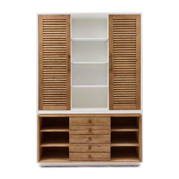Met een royale hoogte van 230 cm, een breedte van 156 cm en een diepte van 42 cm biedt deze buffetkast volop ruimte voor het netjes opbergen van servies, glassware, woonaccessoires of belangrijke essentials. De kast is voorzien van zeven praktische lades en meerdere open en gesloten vakken, waardoor je altijd overzicht en rust creëert in je woonkamer, keuken of eetkamer.