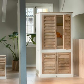 Dit is een ladekast met drie lades en een deur, zo is het een handig meubel in de slaapkamer voor bijvoorbeeld kledingstukken. Deze ladekast behoort tot de Pacifica-serie. Een opvallende lijn met meubels met ‘shutter-look’ van naturel en wit mangohout, met onzichtbare handgreep en softclose-mechanisme. In deze serie zijn verschillende meubels verkrijgbaar.
