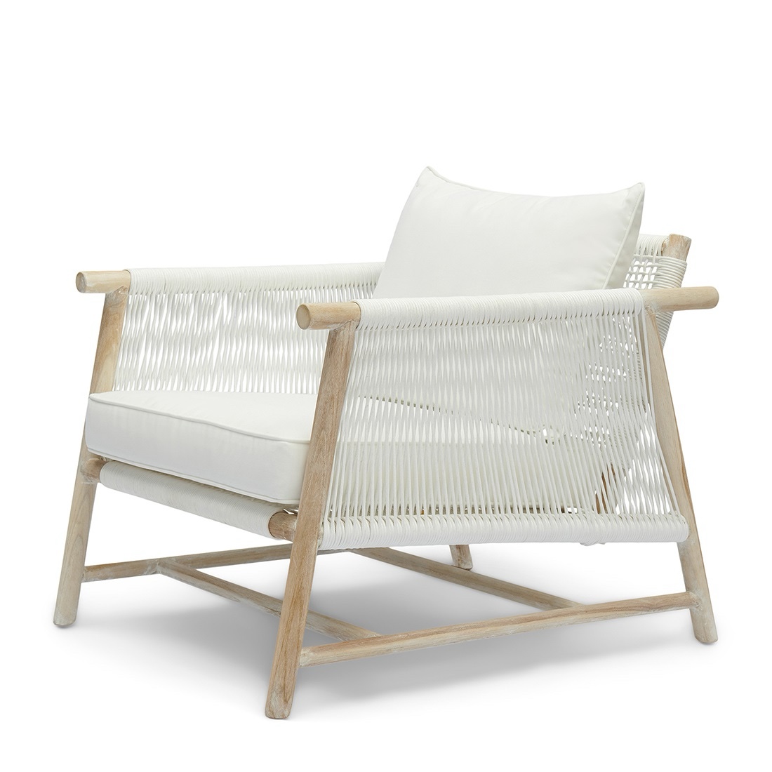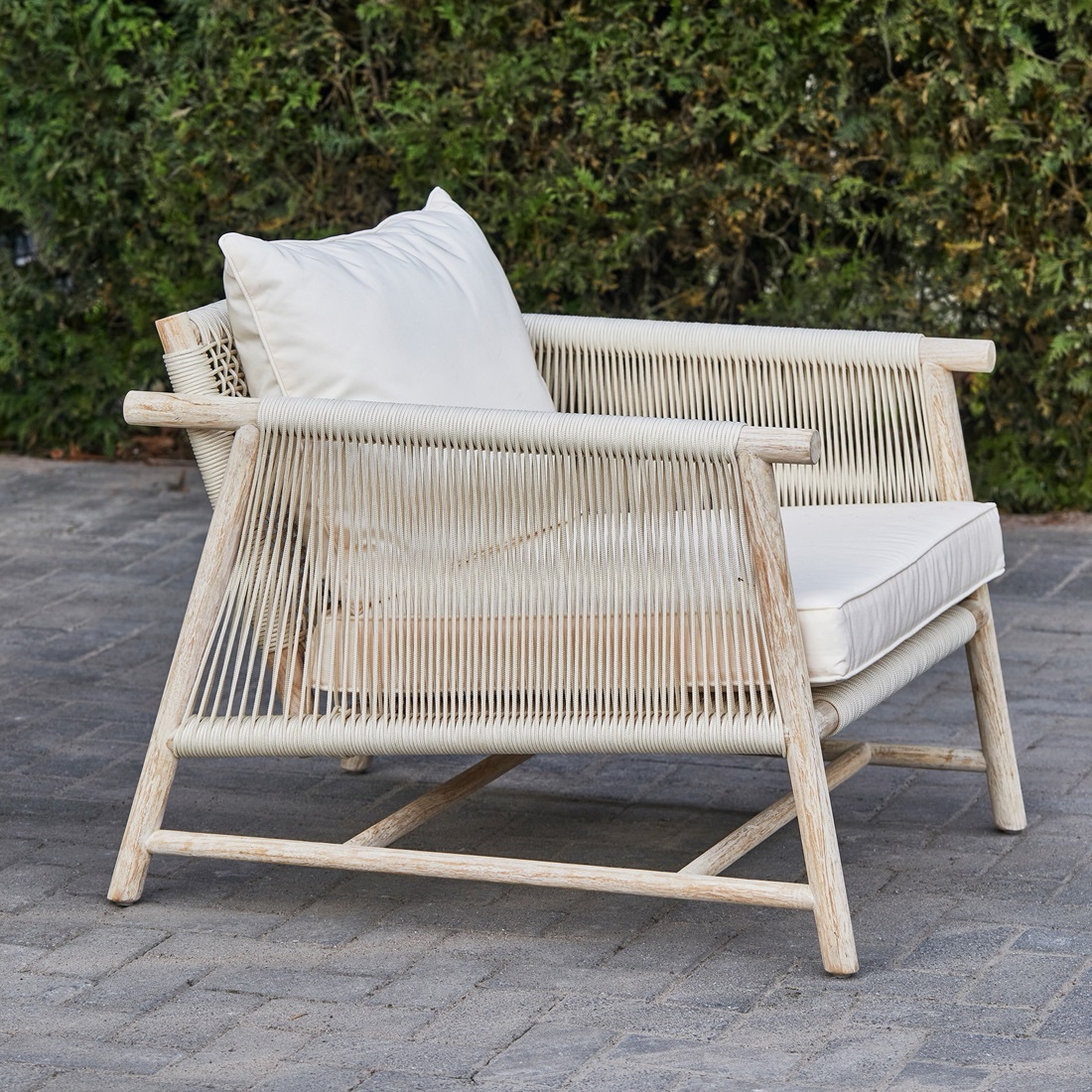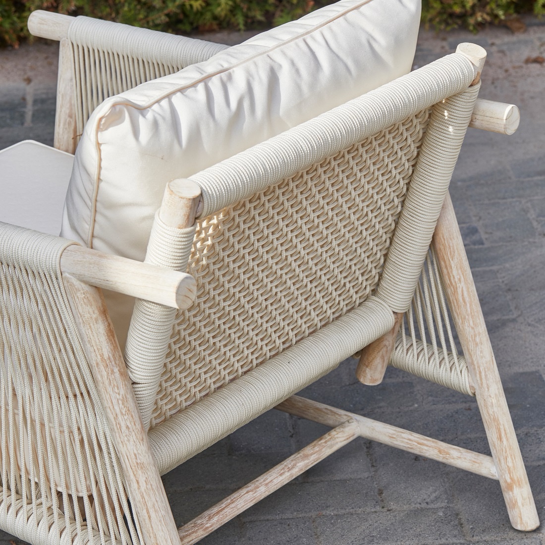 De stoel is vervaardigd uit hoogwaardig teakhout, wat zorgt voor een warme, natuurlijke basis. De zitting en rugleuning zijn gemaakt van all-weather touw, dat niet alleen comfortabel is, maar ook uitstekend bestand tegen verschillende weersomstandigheden. Dit maakt de loungestoel perfect voor langdurig buitengebruik.